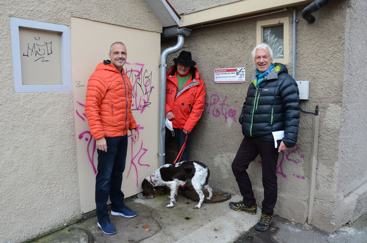 Wann kommt die »Engste Straße der Welt« ihrer Bedeutung gemäß zur Geltung? Das fragen sich die WiR-Stadträte (von links) Marco Wolz, Wolfgang Aichele und Jürgen Straub.