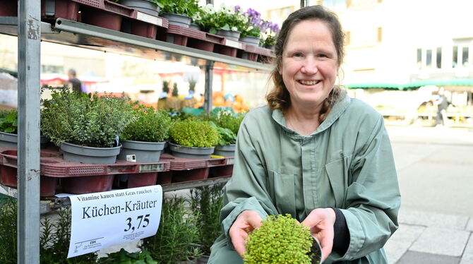 Schwester Amadea von den Dettinger Blumenmönchen hat viele frische Würzkräuter im Sortiment – unter anderem Zitronenthymian, der Fisch- und Fleischgerichten fruchtigen Pfiff gibt. FOTO: PIETH