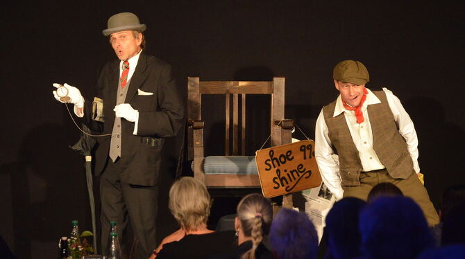 Und wie von Zauberhand befand sich das Publikum im New York der 1920er- Jahre, als sie die Augen wieder öffneten. Der von Sting besungene »Englishman in New York« begegnet auf der Bühne einem Schuhputzer und ein atemberaubender Zauber beginnt, bei dem der Geschäftsmann sekundenlang kopflos ist. Geld wird zu Goldflitter, Scheine gehen in Flammen auf, Messerklingen blitzen. Die sehenswerte Show der ausgezeichneten Zauberbrüder Wolfram und Gernot Bohnenberger, besser bekannt als »Junge Junge!«, trieb den Zuschauern Tränen in die Augen. Sie gingen nicht nur fingerfertig mit Münzen und Seilen um, sondern entlockten mit ihren humorigen Intermezzi immer wieder laute Lacher.