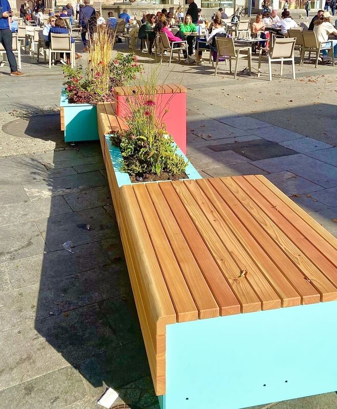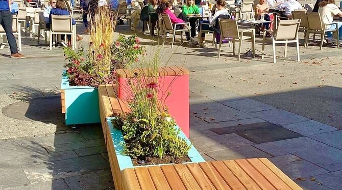 REUTLINGEN. Dem einen oder anderen Besucher der Reutlinger Innenstadt dürfte in den letzten Tagen eine der bunten und bepflanzten Bänke aufgefallen sein. Die sogenannten »City Decks«, die es seit letzter Woche auf dem Marktplatz und am Weibermarkt gibt, »sollen Bürgerinnen und Bürger als auch Touristen zum Entspannen, Plaudern oder für eine kurze Verschnaufpause während der Shoppingtour einladen«, sagt Citymanagerin Yasmin-Miriam Maier vom Reutlinger Stadtmarketing. Die neuen Bänke mit den auffälligen Farben, einer »Herbstbepflanzung« und »geöltem Holz aus dem Schwarzwald« stehen dort zunächst bis Ende Dezember. Dann »wollen wir schauen, wie sie ankommen und genutzt werden«, sagt Maier zu den für drei Monate gemieteten Bänken.