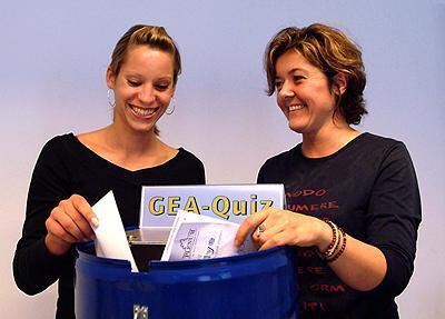 Ein Lächeln als Dreingabe: Beate Bay (rechts) und Simone Ströbele ziehen die Gewinner der GEA-Marktrallye.