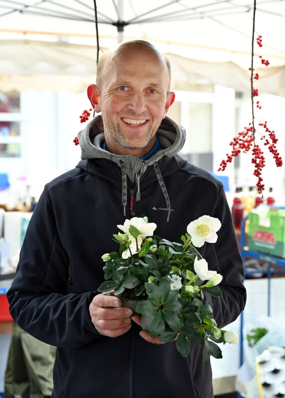 Der Wannweiler Gärtner und Florist Peter Hochstetter hat prächtige Christrosen in seinem Wochenmarkt-Sortiment. Gerne gibt er Tipps zu deren Hege und Pflege.