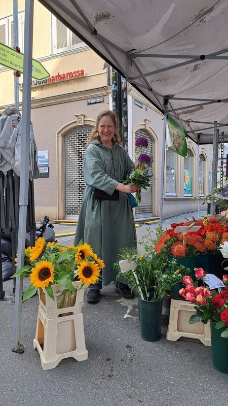 Schwester Amadea, Chefin am Stand der EBK-Blumenmönche, bereitet ihrer Kundschaft gerne florale Freuden, sich selbst übrigens auch.