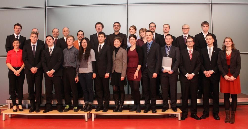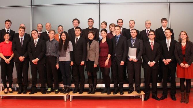 In Feierlaune: die besten Absolventen des Wintersemesters an der Hochschule Reutlingen nebst Dekanen und Prodekanen. FOTO: STRÖHLE
