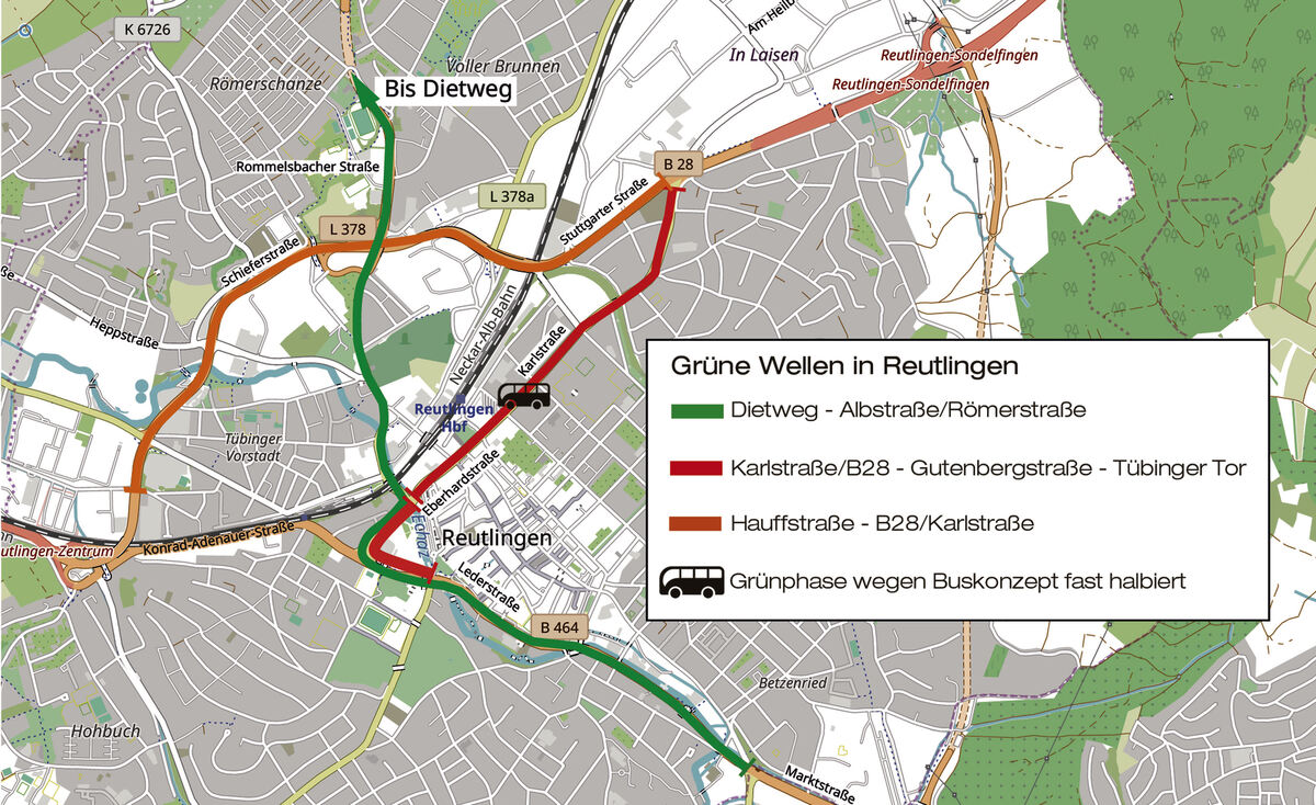 Auf drei Routen durch Reutlingen gibt es theoretisch Grüne Wellen. Manchmal werden sie jedoch gebrochen. Woran das liegt und nach welchen Kriterien Verkehrsteilnehmer priorisiert werden.