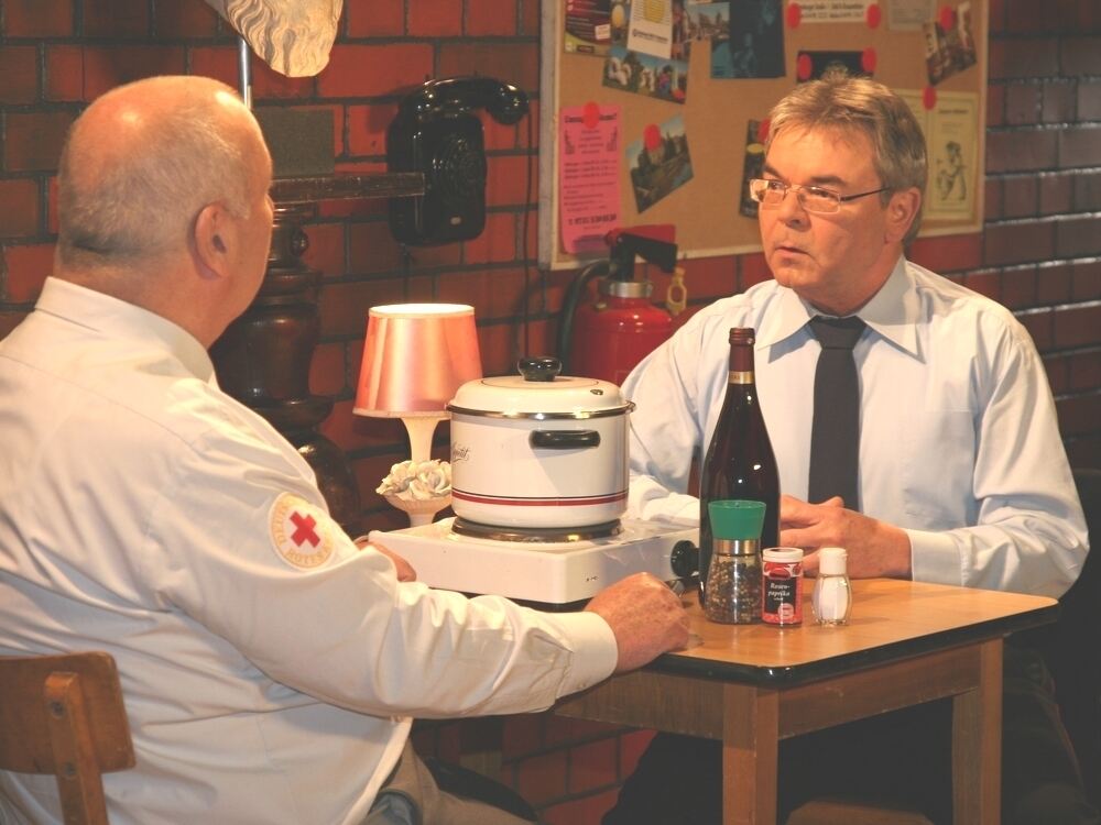 Sanitäter Karlheinz Hartmann (links) und Feuerwehrmann Albin Braig beim Dreh in der Mäulesmühle. Auf dem Tisch eine unsägliche Gulaschsupp’ und ein Fläschle Rotwein.