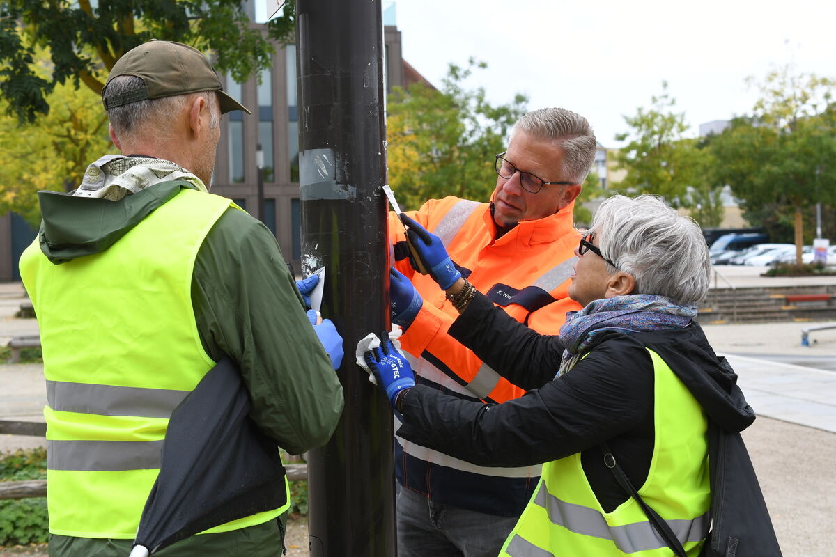 Gemeinsam beim Abschaben von Aufklebern (von links) Hansjörg Schrade (AfD), Finanzbürgermeister Roland Wintzen und Gabriele Janz (Grüne) im Bürgerpark.