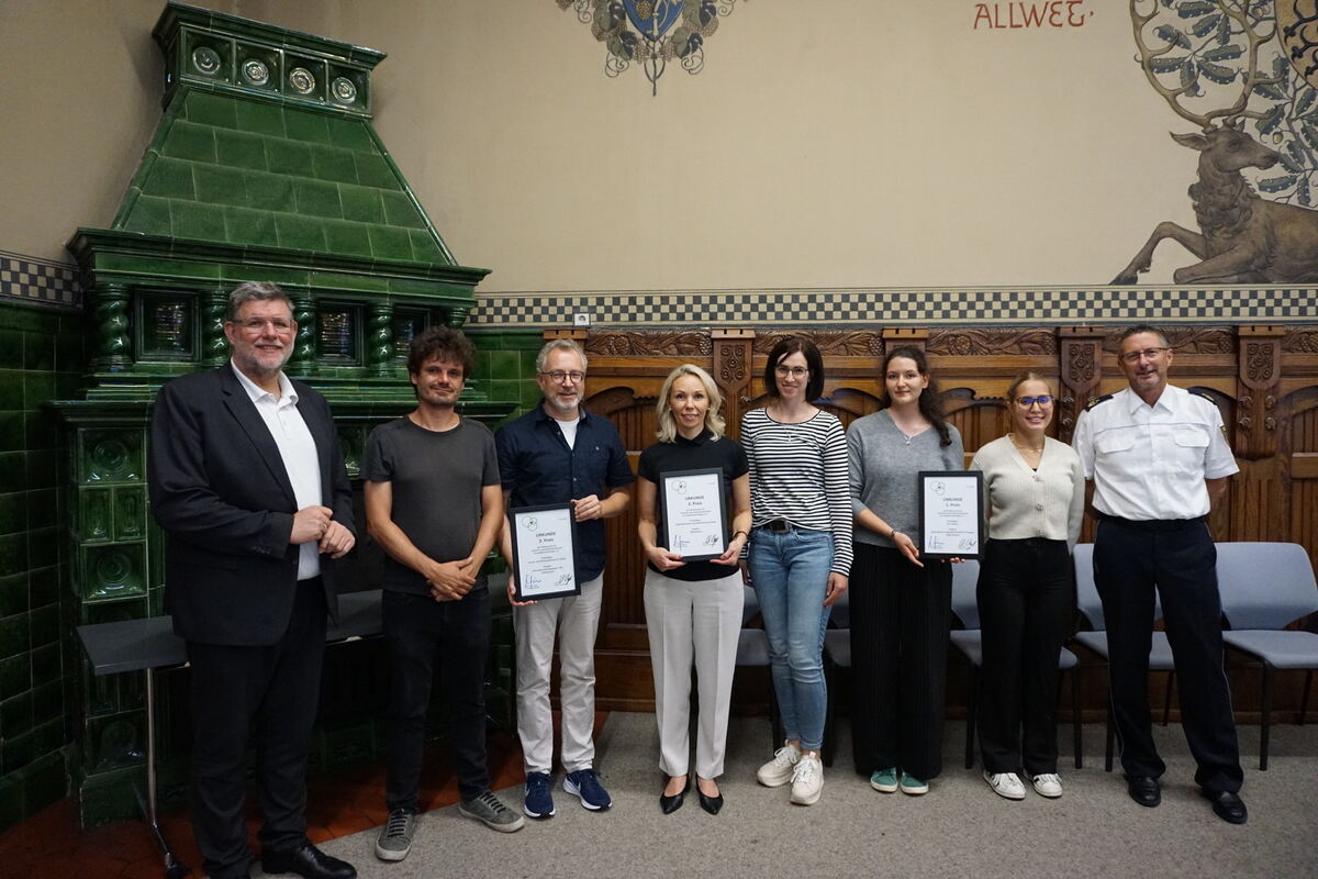 Alle Preisträger mit Landrat Dr. Ulrich Fiedler (links) und Polizeipräsidiumspräsident Udo Vogel.