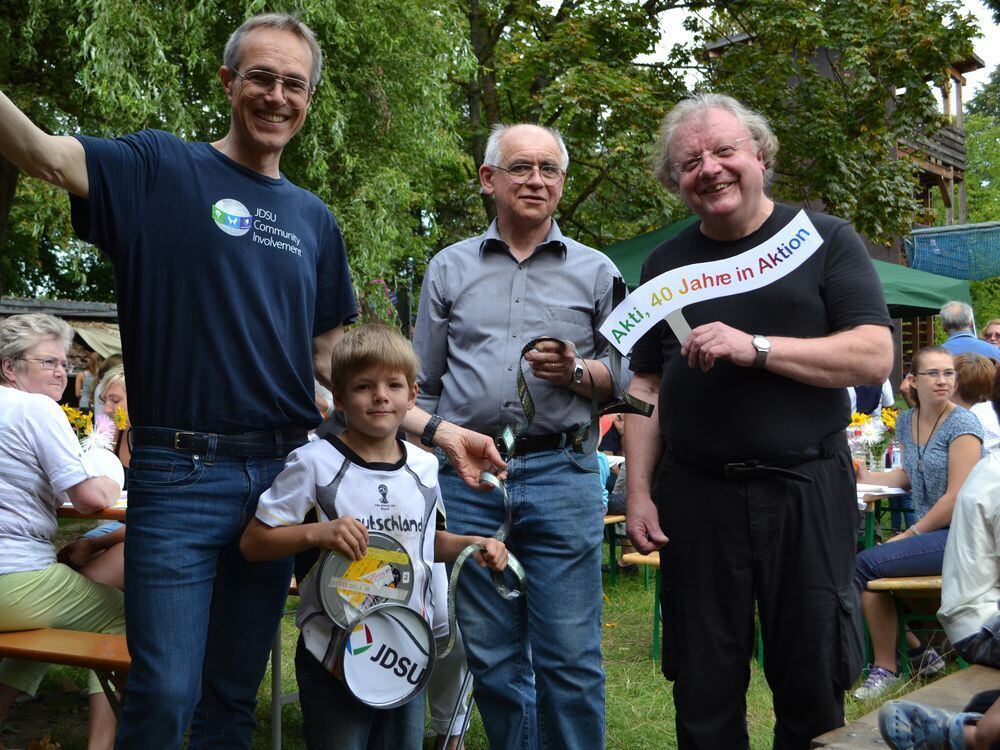 Der Film ist fertig: Als Symbol für die Spende überreichten Reinhard Beneken (links) und Hanns Frère (Mitte) von der JDSU-Möbelinitiative eine Filmrolle. Akti-Besucher Nils und Vorstand Wolfgang Rätz (rechts) waren sichtlich erfreut. FOTO: CHATZINIKOLAOU