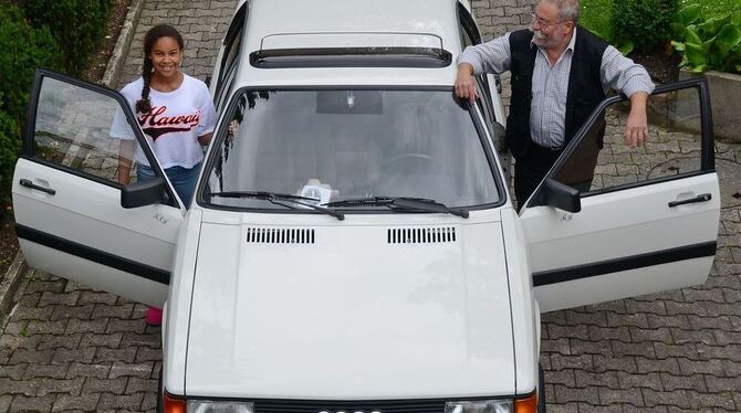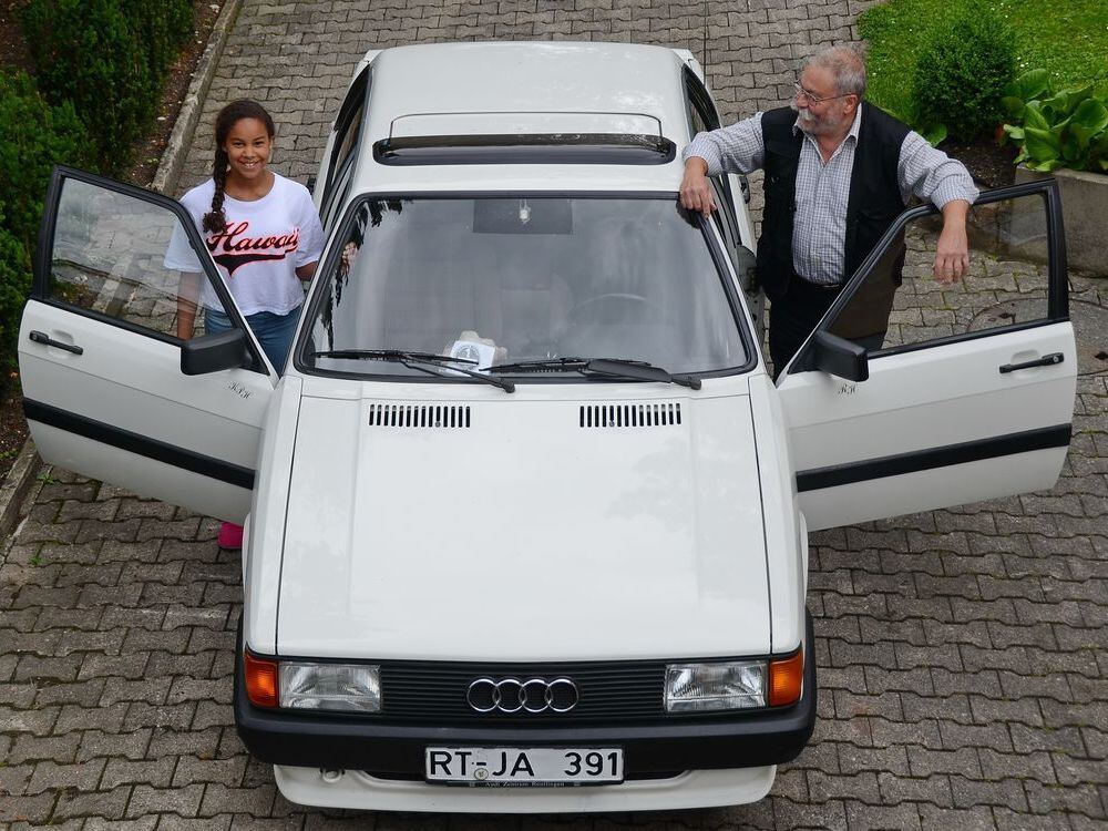 Alpinweißer Oldtimer: Klaus-Peter Härter und seine Enkelin Nora Maria mit dem Audi 80 GTE.