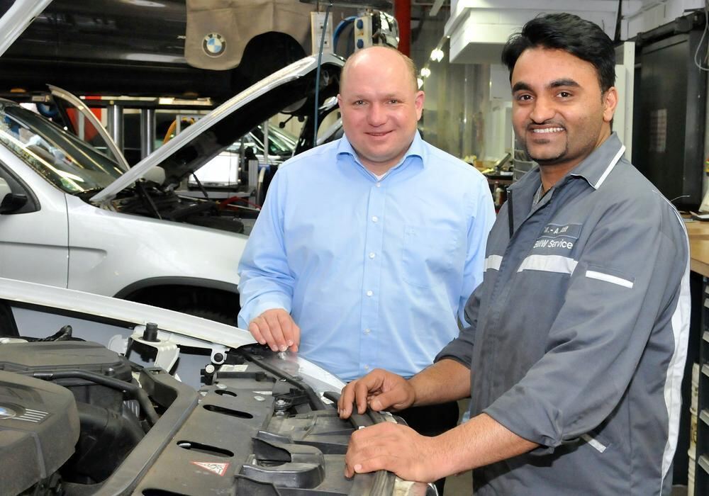 Muhammad Ahsan Atif kennt sich aus mit moderner Fahrzeugtechnik. Thomas Armbruster, kaufmännischer Leiter des Menton Automobilcenters, will seinen neuen Auszubildenden beim Neubeginn in Deutschland unterstützen.FOTO: HANDWERKSKAMMER