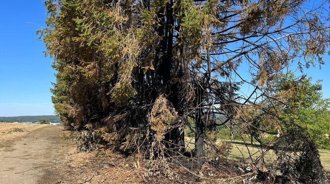Zum ersten Mal wurde die Integrierte Leitstelle in der Nacht von Montag auf Dienstag gegen 0.56 Uhr über einen Brand an einer Baumreihe informiert. Ein Gestrüpp unter den Bäumen stand in Flammen, das Feuer griff dann teilweise auf die Bäume über, teilt Polizeisprecherin Ramona Noller mit. In der betroffenen Baumreihe stehen rund 40 sehr hohe Nadelbäume. Die lodernden Flammen waren kurzzeitig auch bis nach Pliezhausen zu sehen. Sechs Feuerwehrfahrzeuge und 20 Einsatzkräfte waren im Einsatz.