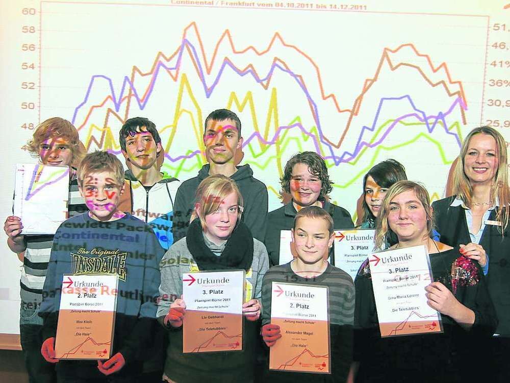 Im Dschungel der Börsenkurse: Die Sieger des GEA-Projekts »Zeitung macht Schule«, die beim Planspiel Börse der Kreissparkasse Reutlingen gewonnen haben. Rechts im Bild Steffi Koch, die das Spiel von der Bank aus betreut hat.