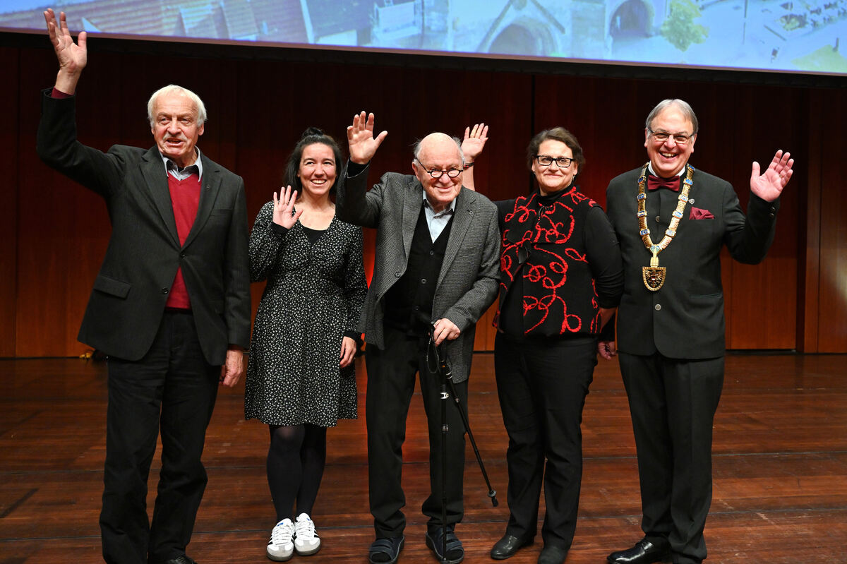 OB Thomas Keck (rechts) überreicht die Bürgermedaille ab Helmut Kober, Ulrike Wolf, die für ihren Vater Professor Roland Wolf anwesend war, Professor Werner Grüninger und Galina Lerner (von links).