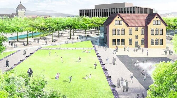 Wo ursprünglich eine einheitliche Schotterfläche vorgesehen war, soll nun Rasen gepflanzt werden und ein Wasserspiel mit »dampfförmigem Wassernebel und Wassersäulen« (rechts) auch zum Verweilen und Spielen einladen. GRAFIK: KIENLE-PLAN