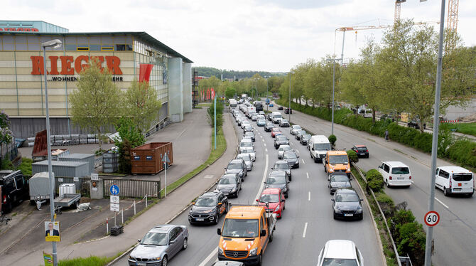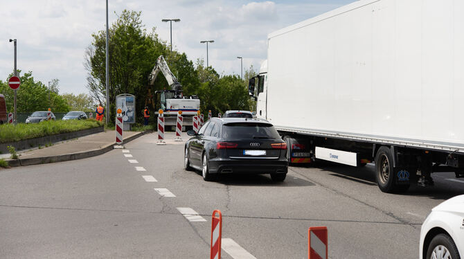 Die meisten Autofahrer interessieren sich in der Mittagspause noch nicht sonderlich für die Baustelle, auf der es mit einem Bagger und einem Lkw eher gemächlich zugeht. Aber das hat sich am Nachmittag schon geändert: Es geht nur noch im Schritttempo voran, vor allem für all diejenigen, die Richtung Stuttgart und Metzingen Stoßstange an Stoßstange im Stau stehen und viel länger als ihnen lieb ist unterwegs sind – zurück bis zur Ecke Emil-Adolff-Straße staut sich der Verkehr auf der Schieferstraße kilometerlang.