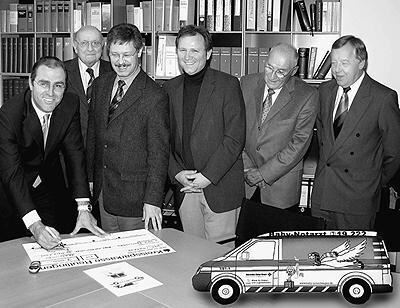 Bald rollt der Baby-Notarztwagen über Land: Spender wie die Ilse-Graulich-Stiftung erlauben dem Roten Kreuz die Anschaffung des Fahrzeuges für ganz kleine Patienten. Im Bild (von links) Stiftungsleiter Hermann Lang, Dr. Kuno Ziegler, Dieter Hillebrand und Michael Tiefensee vom DRK, Dr. Paul Irion und Rainer Kehrer.