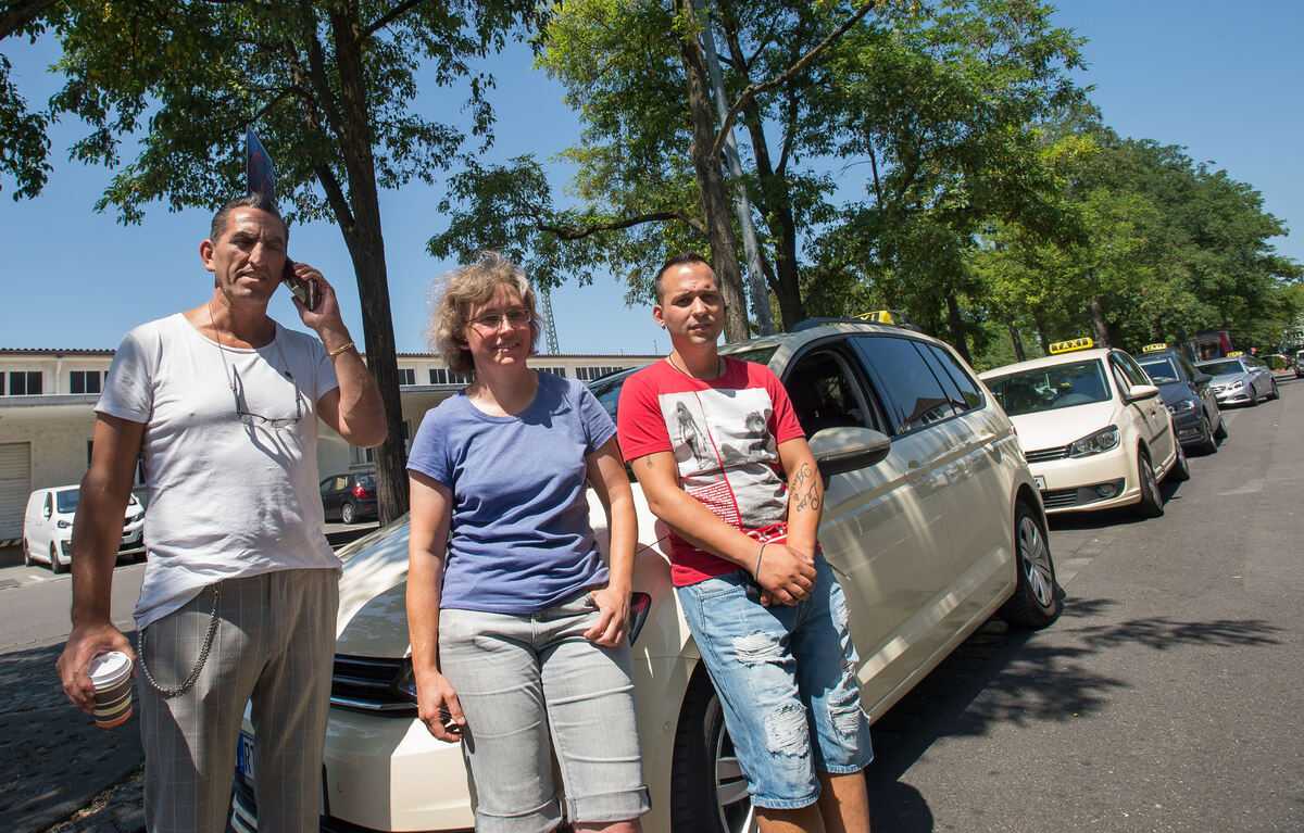 Blattläuse, Hitze, keine Toilette: Reutlinger Taxifahrer (von links Beyazit Kus, Julia Rasch und Bruno Barbosa) wünschen sich verbesserte Arbeitsbedingungen an ihrem Warteplatz in der Bahnhofstraße. FOTO: TRINKHAUS