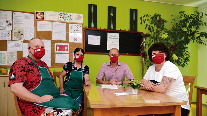 Mit AWO-Maske sieht man’s ihnen nicht an, aber Jan Marco Purin, Anna Budnik (beide vom Küchenteam), AWO-Geschäftsführer Ulrich Högel und Einrichtungs-Leiterin Eva Sutter freuen sich, dass es bald wieder »richtig« losgeht im Tagestreff.
