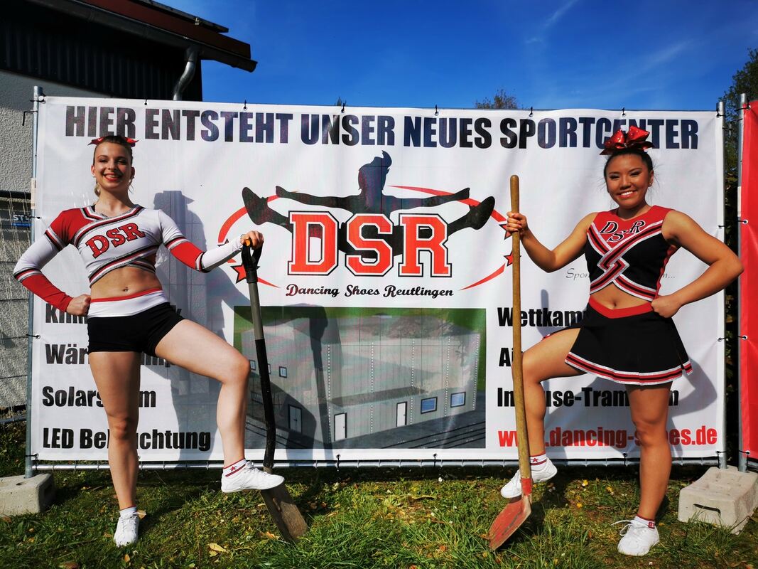 Cheerleaderinnen Kim Binder (links) und Jenny Vo von den Dancing Shoes Reutlingen beim symbolischen Spatenstich für den Bau der neuen Halle. FOTOS: PRIVAT