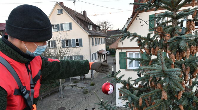 REUTLINGEN-MITTELSTADT. Viele Adventsfreuden müssen dieses Jahr coronabedingt ausfallen. Insbesondere auch die Weihnachtsmärkte werden viele vermissen. Ein kleiner Trost: In Mittelstadt wurde am Samstag vor dem Rathaus ein »Baum der Hoffnung« weihnachtlich bestückt, den Bezirksgemeinderat Eberhard Müllerschön zuvor mit einigen Helfern aufgerichtet hatte. Sein Ratskollege Daniel Böhringer (Foto) ließ sich zum Schmücken von Marc Hensel mit dem Teleskoplader in die Höhe lupfen. Die Tanne erleuchtet dieses Jahr nicht nur wie sonst eine Lichterkette: Die drei Kindergärten, das »Kinderreich« und die Grundschule haben Kugel-Rohlinge bemalt und gestaltet. Der Förderverein Mittelstädter Kinder, »Miki«, hat das Projekt finanziell unterstützt. (GEA)