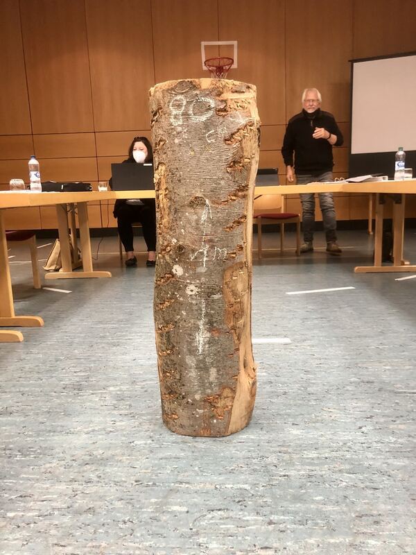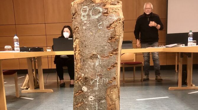 Der Baumstamm, den die Mitarbeiter der Stadtverwaltung mitbrachten, stand im Zentrum der Diskussionen. FOTO: LEIPOLD