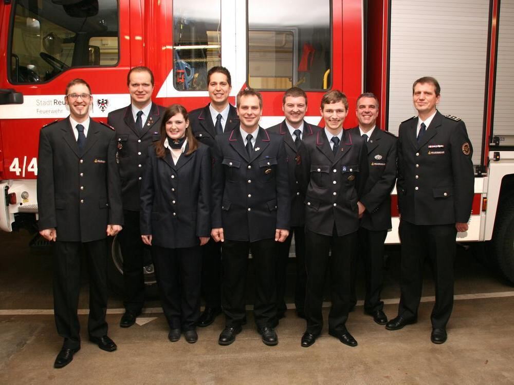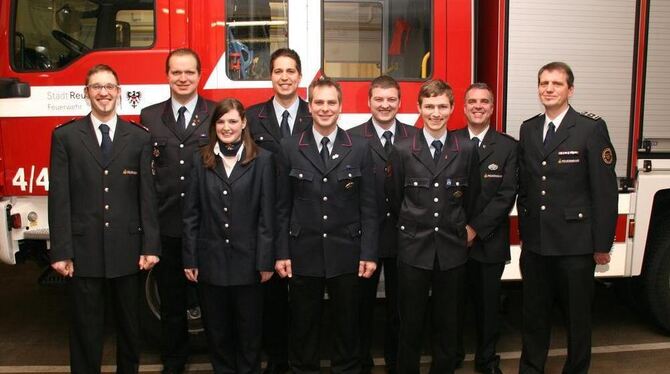 Die Geehrten und Beförderten der Sondelfinger Feuerwehr (von links): Abteilungskommandant Thorsten Lipp, Daniel Dittmann, Marina Groß, Andreas Dittmann, Jan Jahn, Tim Müßle, Gregor Krohmer, Thomas Walz sowie Martin Reicherter. FOTO: FW
