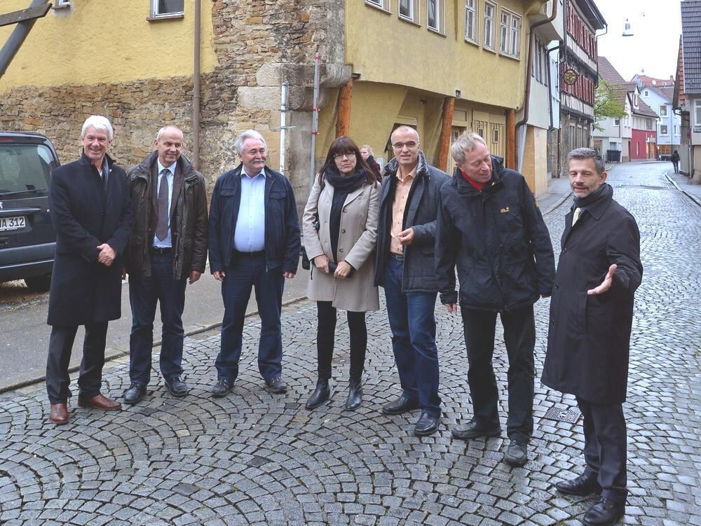 Der Leiter des Gebäudemanagements Peter Geyer (ganz rechts) mit Mitgliedern des Bauausschusses vor dem Gebäude Oberamteistraße 32.