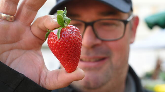 Martin Frech mit einer Erdbeere. An der komplett roten Färbung ist der Reifegrad erkennbar. Diese Frucht stammt aus Italien, demnächst kommt deutsche Freilandware.