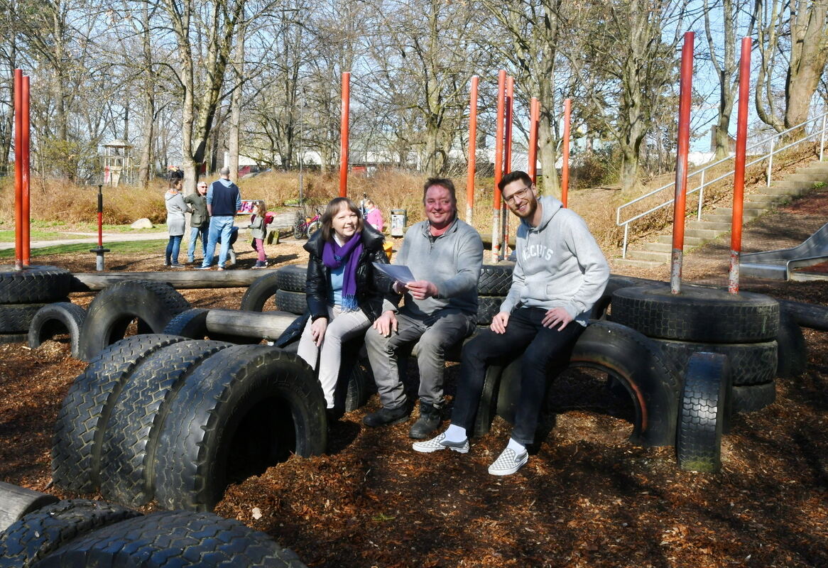 Den konventionellen Spielplatz an der Altenwaldstraße zum Generationenspielplatz auszuweiten, hat sich der Rommelsbacher Bezirksgemeinderat vorgenommen. Gabriele Gaiser, Markus Kern und Peter Meinhardt (von links) erläutern beim Vor-Ort-Termin, warum sie vom Erfolg eines solchen Sportparks überzeugt sind.