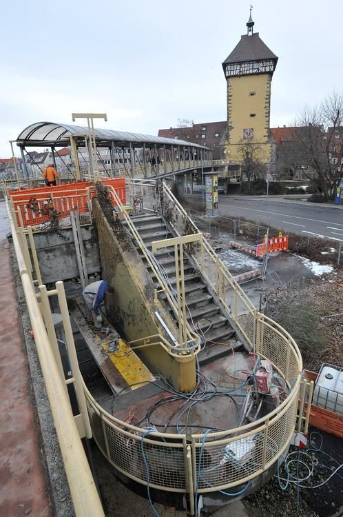 Die alte Treppe am Fußgängersteg vor dem Tübinger Tor wird abgesägt. Sie soll einer Baustellentreppe und provisorischen Rampe Platz machen.