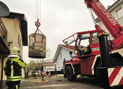 Zum letzten Mal Betzinger Luft geschnuppert: In einer Rettungsaktion der besonderen Art hievte die Reutlinger Feuerwehr gestern den Zweimannbunker mit einem 30-Tonnen-Kran auf den Tieflader, der ihn ins Stuttgarter Museum brachte.