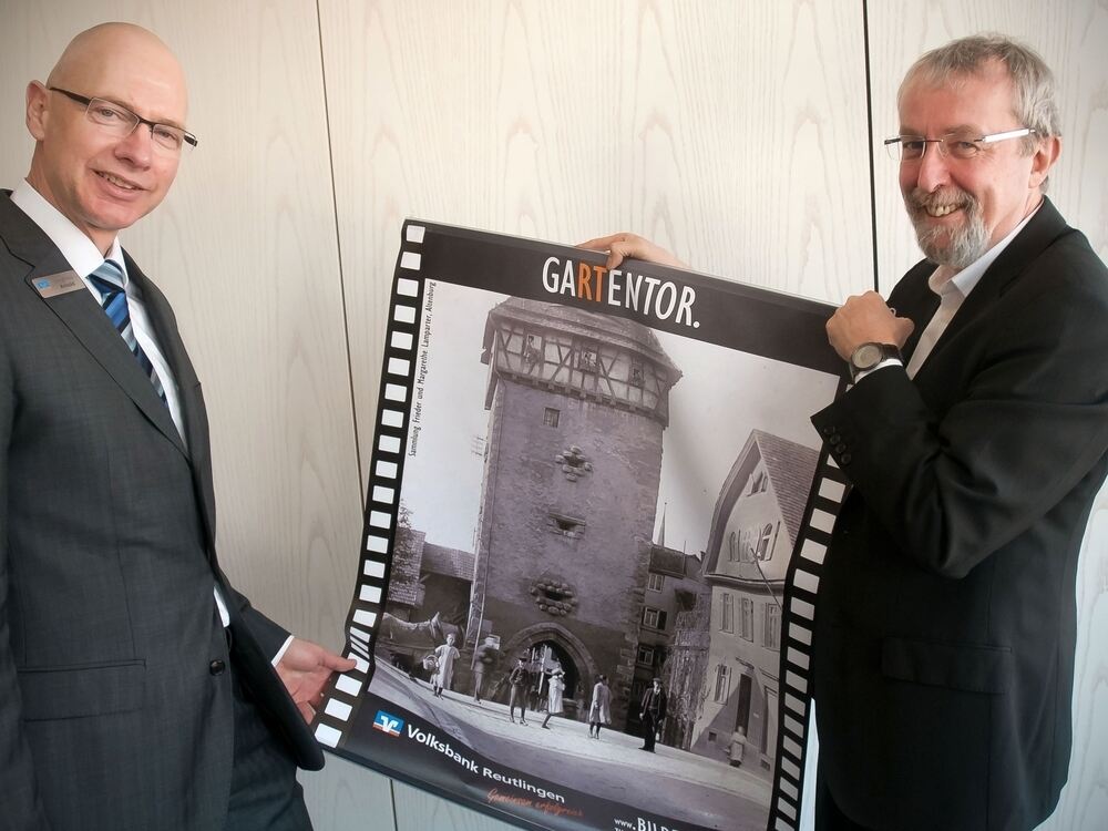 »BildeRTanz«: Siegfried Arnold vom Vorstand der Volksbank (links) und Raimund Vollmer mit einem der »normalformatigen« Fotos, wie sie bald in den Schaufenstern der Innenstadt zu sehen sein werden.