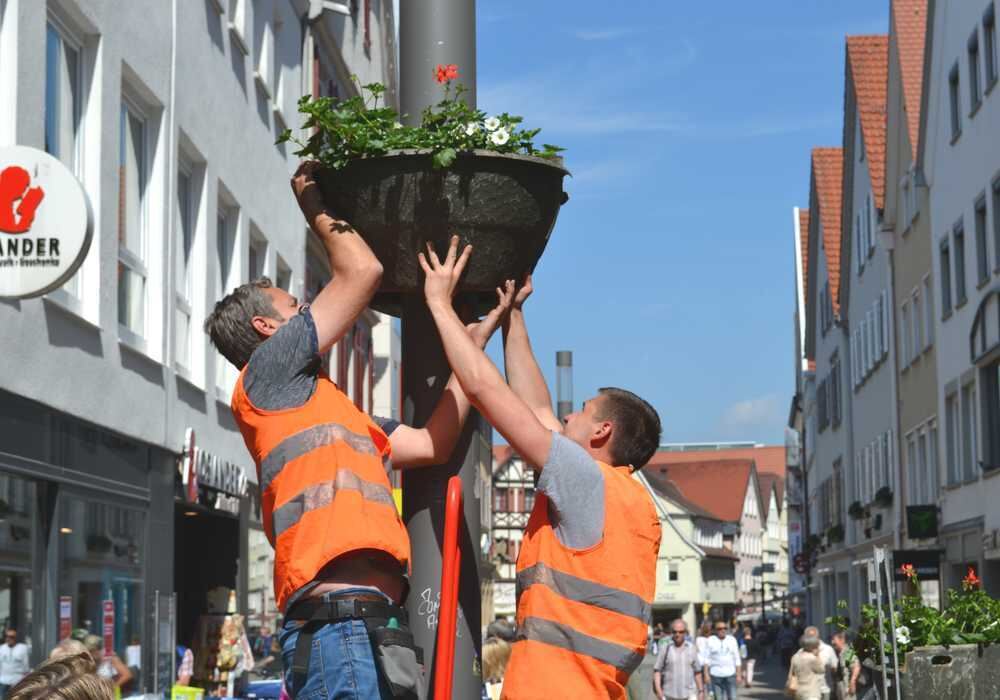 Fachleute in oranje: Die beiden Mitarbeiter einer holländischen Firma bringen die bepflanzen Halbschalen am Laternenmast an. Die roten Geranien und weißen Petunien sollen schon in wenigen Wochen über die Gefäße aus Polyester hinunterragen und diese komplett verdecken.