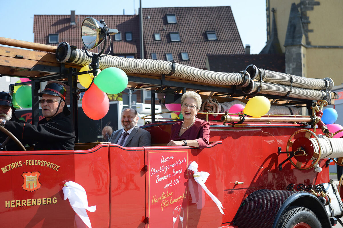 REUTLINGEN. Das Treppensteigen konnten sich Barbara Bosch und ihr Mann Friedemann Kuhn dabei sparen, denn die Feuerwehr hievte sie mit ihrer – modernen – Drehleiter direkt zu den wartenden und winkenden Gratulanten auf den Balkon.