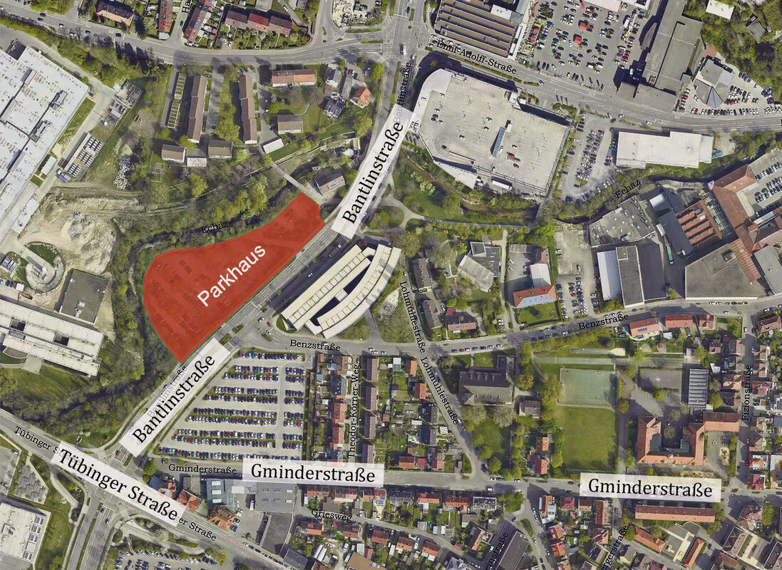 Auf dem bisherigen Besucherparkplatz (rot markierte Fläche) entlang der Bantlinstraße will Bosch ein neues Parkhaus bauen. Es ist Teil des »betrieblichen Mobilitätsmanagements« – neben Jobticket, Mitfahrmöglichkeiten und neuen Busstationen. Foto: Stadt Reutlingen