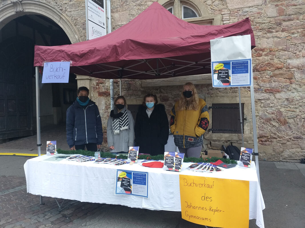 Schüler des Johannes-Kepler-Gymnasiums verkaufen ihr Buch auf dem Marktplatz in Reutlingen. FOTO: PRIVAT