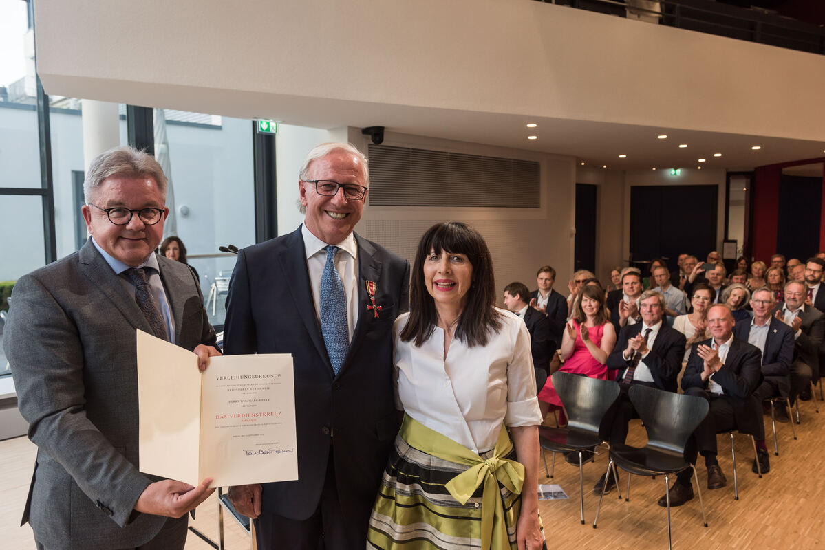 Der Gedanke der Achtsamkeit gegenüber dem Bestehenden ziehe sich wie ein roter Faden durch sein ganzes Wirken – sei es im Beruf, im Ehrenamt, in der Architektur oder eben in Europa, stellte der Laudator abschließend fest. »Wenn im Sinne des Eingangszitats gilt, dass ohne Architektur die menschliche Gesellschaft nicht denkbar wäre, dann muss erst recht gelten, dass unsere menschliche Gesellschaft nicht ohne soziale Architekten möglich wäre, wie Sie einer sind.« Dafür und für sein beeindruckendes Lebenswerk gratulierte ihm Wolf und steckte ihm das Bundesverdienstkreuz am Bande an das Revers.