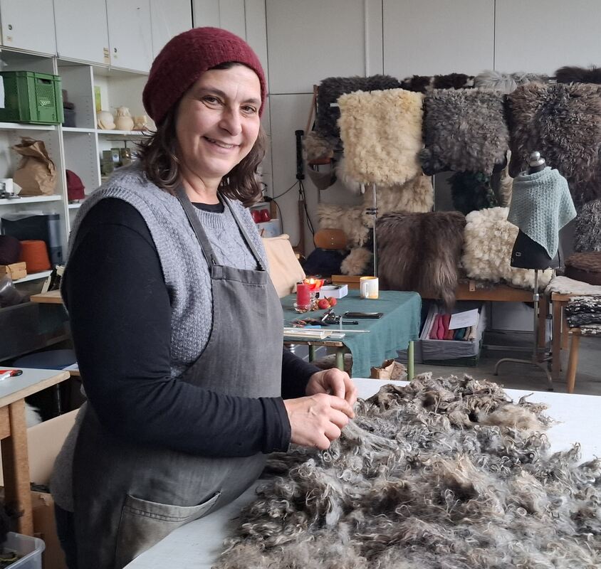 Nebenan produziert Sibylle Eschenlohr »Veggie-Felle« ohne Lederbezüge aus der Rohwolle von Schafen. Die Wolle kommt überwiegend von regionalen Tierhaltungen. »Ich habe mir das selbst beigebracht und so lange probiert, bis es funktioniert«, sagt Eschenlohr. Die Agraringenieurin und Textilgestalterin ist vor zehn Jahren über die städtische Homepage auf ihr Domizil gestoßen.