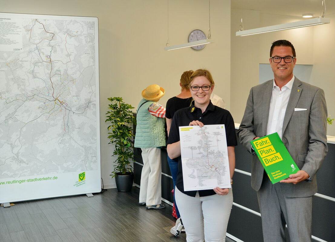 In der RSV-Mobilitätszentrale gibt es (fast) alles, was das Busnutzer-Herz erfreut: nicht nur das große Fahrplanbuch und einen faltbaren Netzplan, den Teamleiterin Stefanie Ammer und Bernd Kugel präsentieren. Fotos: niethammer