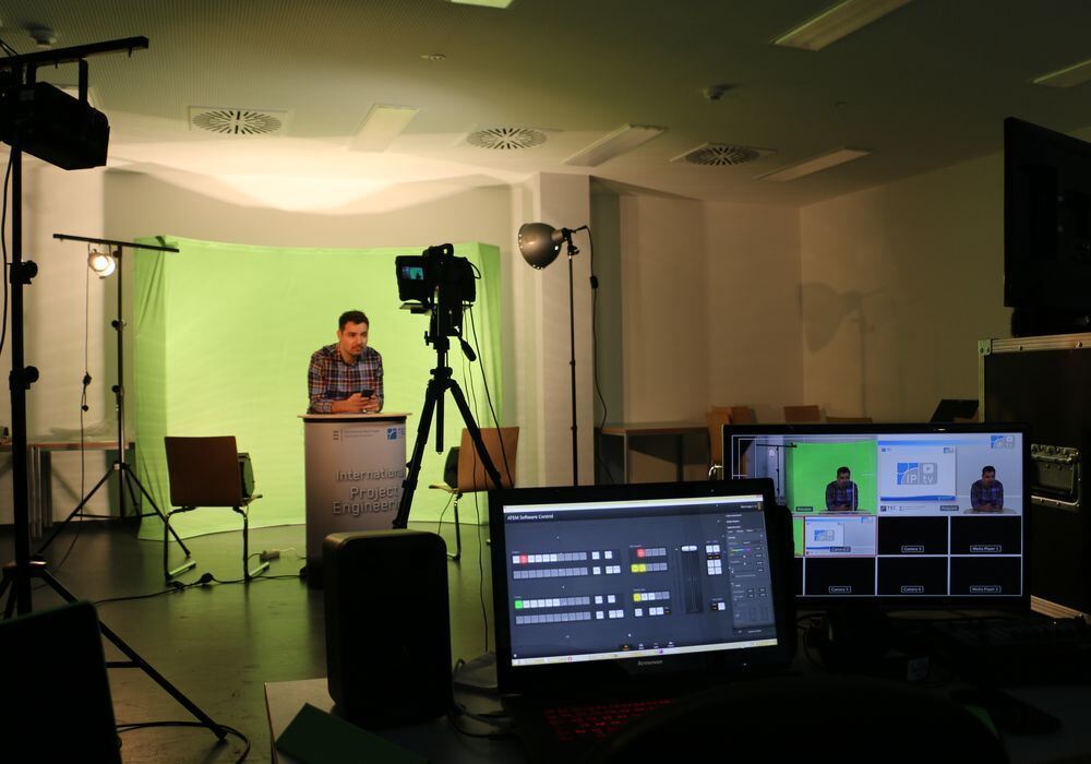 Student Harun Saglam beim Videodreh vor einem »Greenscreen« – damit kann hinter Moderatoren, wie bei TV-Sendungen, ein anderer Hintergrund eingeblendet werden. FOTO: PR