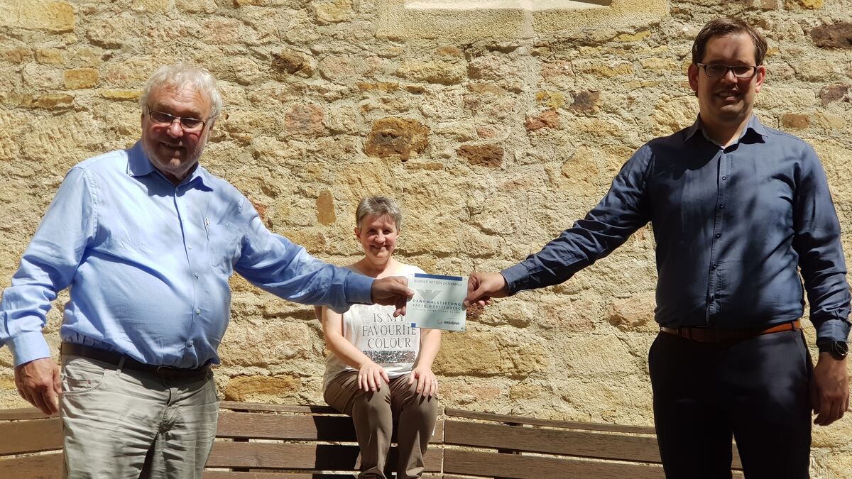 Professor Rainer Prewo (links) von der Denkmalstiftung Baden-Württemberg überreicht Pfarrer Jonathan Hörger-Jebe eine Plakette, die in der Kirche angebracht werden soll. Kirchenpflegerin Marlies Osmer ist froh, dass die Finanzierung der Sanierung damit fast unter Dach und Fach ist. FOTO: KÜSTER