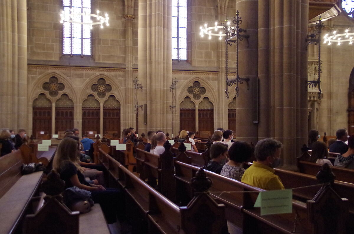 Fast alle der Konfirmanden sind der Einladung gefolgt, am Vorabend ihres ursprünglichen Konfirmationstermins in die Marienkirche zu kommen, gemeinsam mit ihren Eltern und Geschwistern. FOTOS: KIRCHE