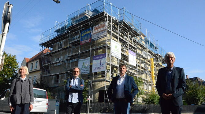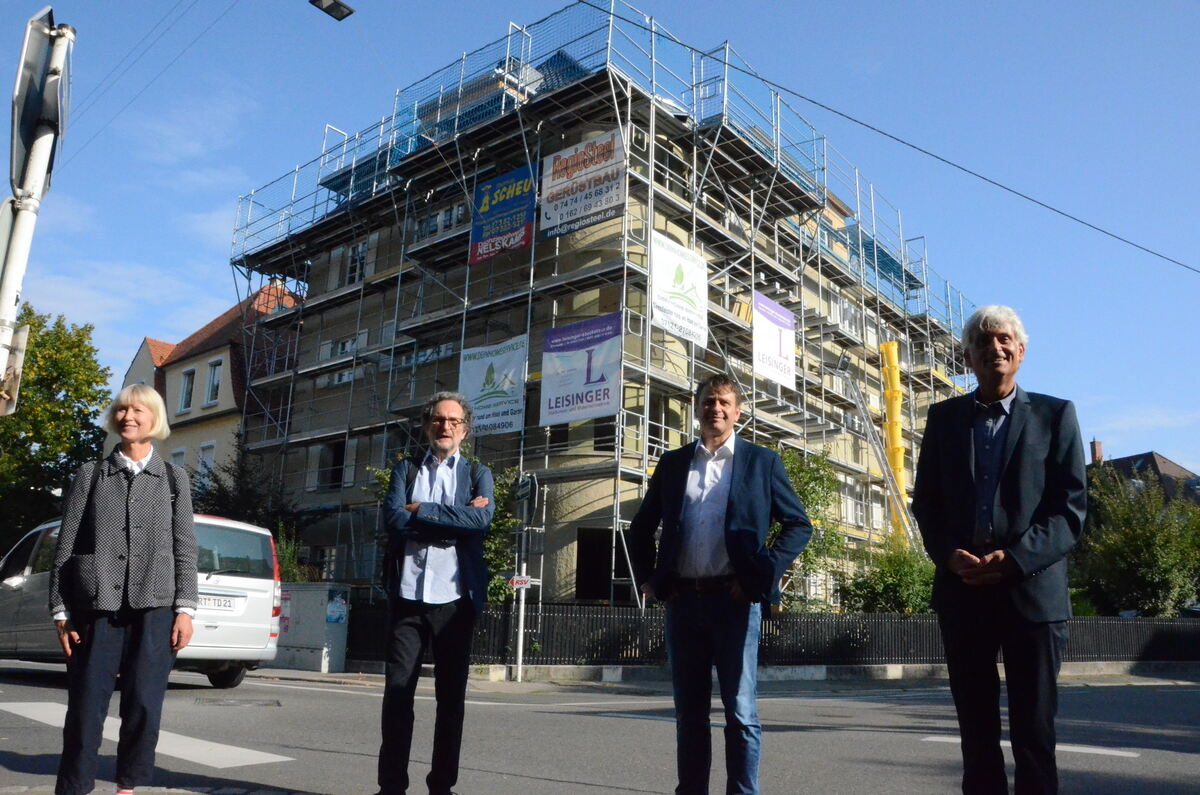 Thomas Siewert (Zweiter von rechts), Bauherr des Sanierungsobjekts Bismarckstraße 83, ging auf die Vorschläge des Gestaltungsbeirats ein. Jórunn Ragnarsdóttir (links) und Christof Luz (Zweiter von links) sowie Stadtplaner Stefan Dvorak vor dem Objekt. FOTO: CONZELMANN