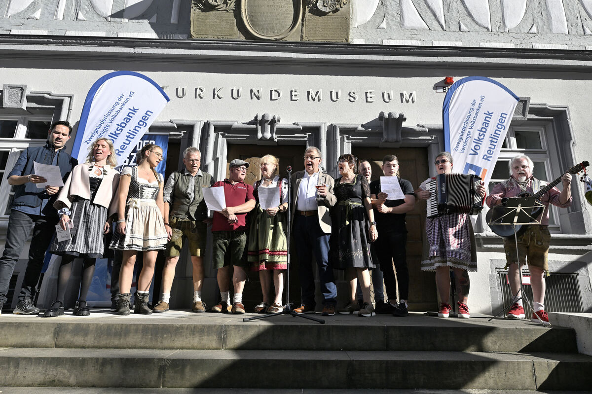 Mit dem »Reutlinger Weindorf-Lied«, das die Wirtinnen und Wirte unterstützt vom Stauferland-Duo mit Tanja Baumeister am Akkordeon und Helmuth-Josef Keller an der Gitarre singen, und dem traditionellen Viertele Rosé wird das 37. Reutlinger Weindorf inmitten der Altstadt eröffnet. Gefeiert wird das »Geselligkeit-ist-Trumpf-lingen« 14 Tage, bis 7. September, wobei die Lauben sonntags und montags geschlossen bleiben. (GEA)