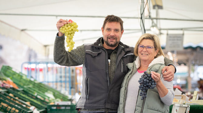 Marktbeschicker Alexander Bunzel und seine Mutter Theresia haben derzeit viele verschiedene Tafeltraubensorten im Angebot.