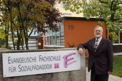 Rektor Dr. Hans-Georg Kelterborn vor seiner Fachschule an der Kreuzeiche.