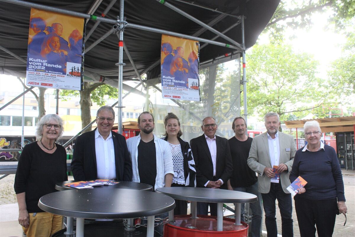 »Kultur vom Rande«-Strippenzieherinnen und -Strippenzieher bei der Programmvorstellung im Echaz-Hafen (von links): Rosemarie Henes, Schirmherr und Oberbürgermeister Thomas Keck, Markus Christ, Leoni Wodetzky (Reutlinger Kulturbüro Klick), Martin Keller (Lebenshilfe Reutlingen), Andreas Roth (franz.K), Christian Freisem (Bruderhaus-Diakonie) und Elisabeth Braun.