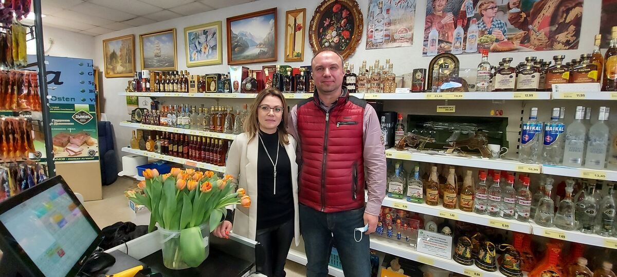 Nelli Meinhardt, Mitarbeiterin, und Kasimirs Ksarowinskis, Betreiber des Lebensmittelladens »Taiga« in Auingen.