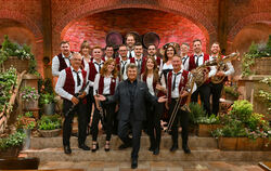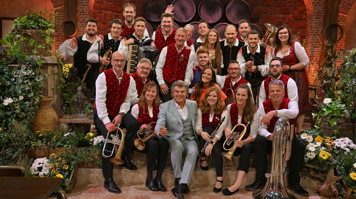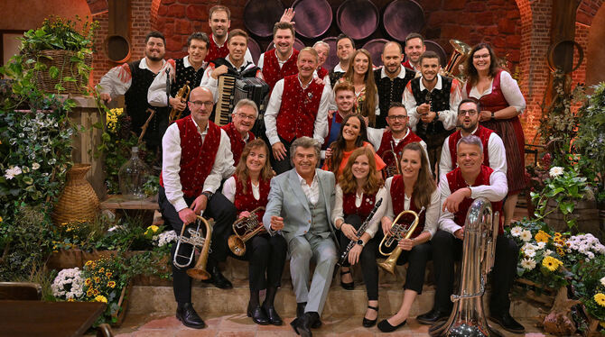 Schlager-Star und Moderator Andy Borg (im grauen Anzug) und die Musiker aus Degerschlacht (rote Tracht) hatten viel Spaß beim Wiedersehen. Mit auf dem Gruppenfoto: Saso Avsenik, zu dem der Musikverein eine besondere Verbindung hat, und seine Oberkrainer.